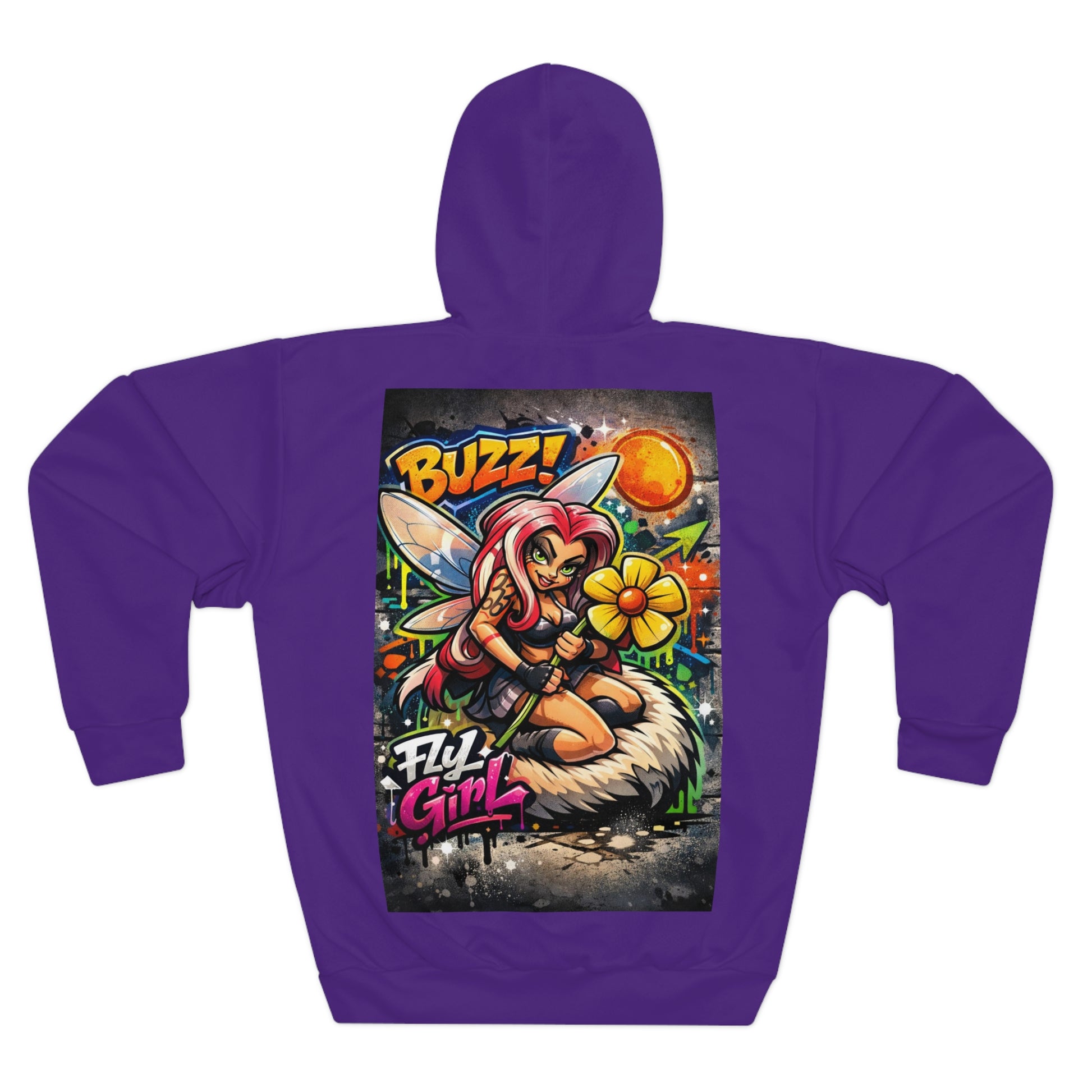This hoodie brings bold street-art energy to a cozy, everyday silhouette. The deep purple fabric makes the colorful graffiti logo on the chest pop, while the large, vibrant back panel — a comic-style ‘Fly Girl’ scene with buzzing neon tones and playful details — turns heads. It feels like wrapping yourself in an urban mural: warm, slightly oversized, and alive with color. Wear it when you want to add attitude to a hoodie-and-jeans look, when you need an extra layer for late-night walks through the city, or when a creative studio day calls for something that matches your loud imagination. The roomy kangaroo pocket tucks hands or small gear away, and the adjustable hood lets you dial the vibe from laid-back to street-ready. This is for people who collect bold visuals and want clothing that reads like a canvas.